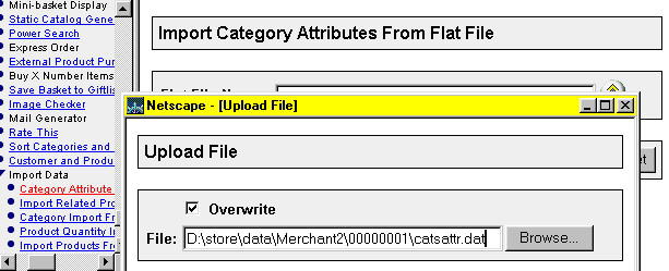 Initial Setup and Usage Use the Merchant admin upload feature to upload the module catsattr.mvc to the server. Then click the Add button to add it to the mall/domain. Import modules automatically reside in each store within a domain so there is no need to update them to the store. Import: Click on the image to the left of the word Utilities under the store. Then click on the image for Import Data. Then click on the link for Category Attribute Import. Upload the flat file from your PC.