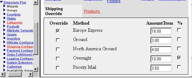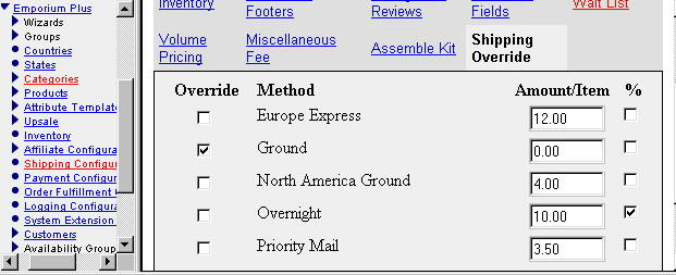 Category Setup 1) Click on the link to the category that you want to have category wide variation of shipping charges different from the storewide charges you defined above 2) Click the tab "Shipping Override" 3) If you want to vary the charges from the default (which is displayed automatically) check the box for Override 4) Change the values accordingly and Update |